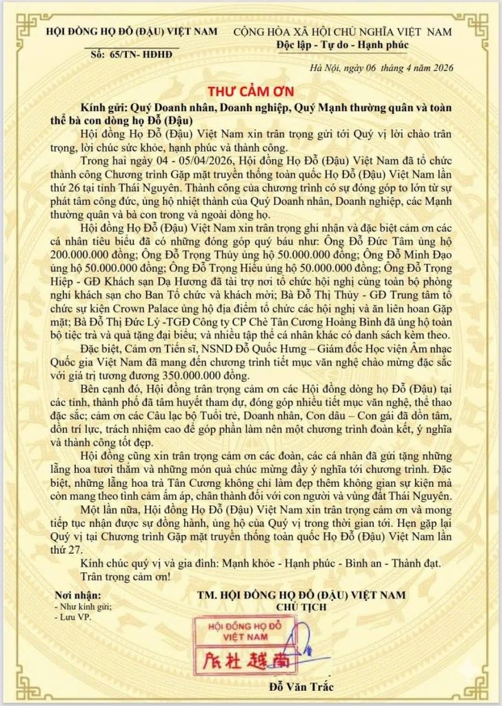 Tôi tự hào : tôi là con cháu dòng họ đỗ ( đậu ) việt nam được sinh ra và sống tại Việt nam , tôi luân luân biết ơn tổ tiên đã dẫn lối chỉ đường cho tôi , là con cháu của dòng họ đỗ cùng đồng hành với con cháu họ đỗ trên toàn quốc. Tôi biết ơn các vị đã sáng lập và lãnh đạo họ đỗ,nhân dịp ngày giỗ họ hàng năm 15 tháng 2 âm lịch, chúng tôi được gặp mặt nhau trên toàn quốc, qua buổi gặp mặt truyền thống tại Thái nguyên vì đông con cháu nên không biết hết được, qua bức thư cảm ơn của chủ tịch họ đỗ việt nam, tôi càng tự hào, và thấm đậm tình huyết thống , tôi xin gửi lời cảm ơn chân thành đến ô đỗ văn trắc cùng tập thể ban lãnh đạo họ đỗ ( đậu ) Việt Nam, xin kính chúc sức khỏe đến các vị , để lãnh đạo họ đỗ ta ngày càng hạnh phúc, thành công, thịnh vượng.